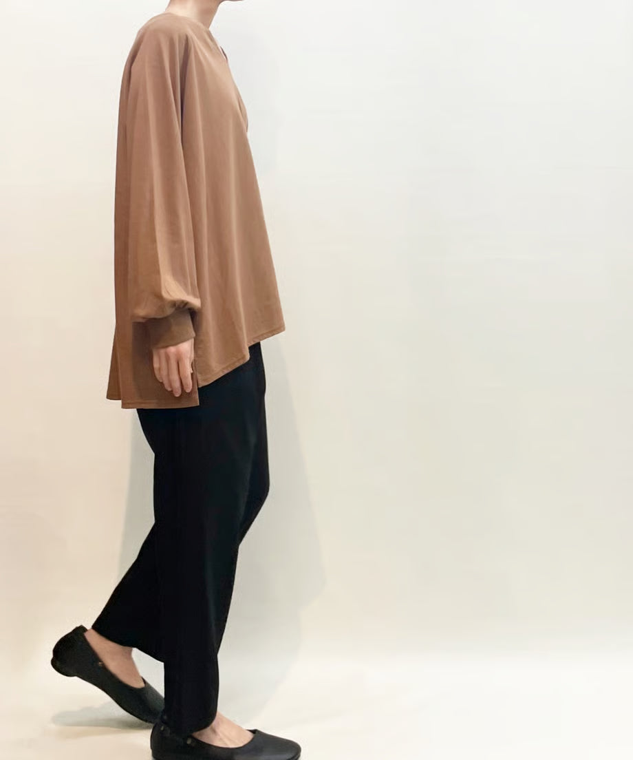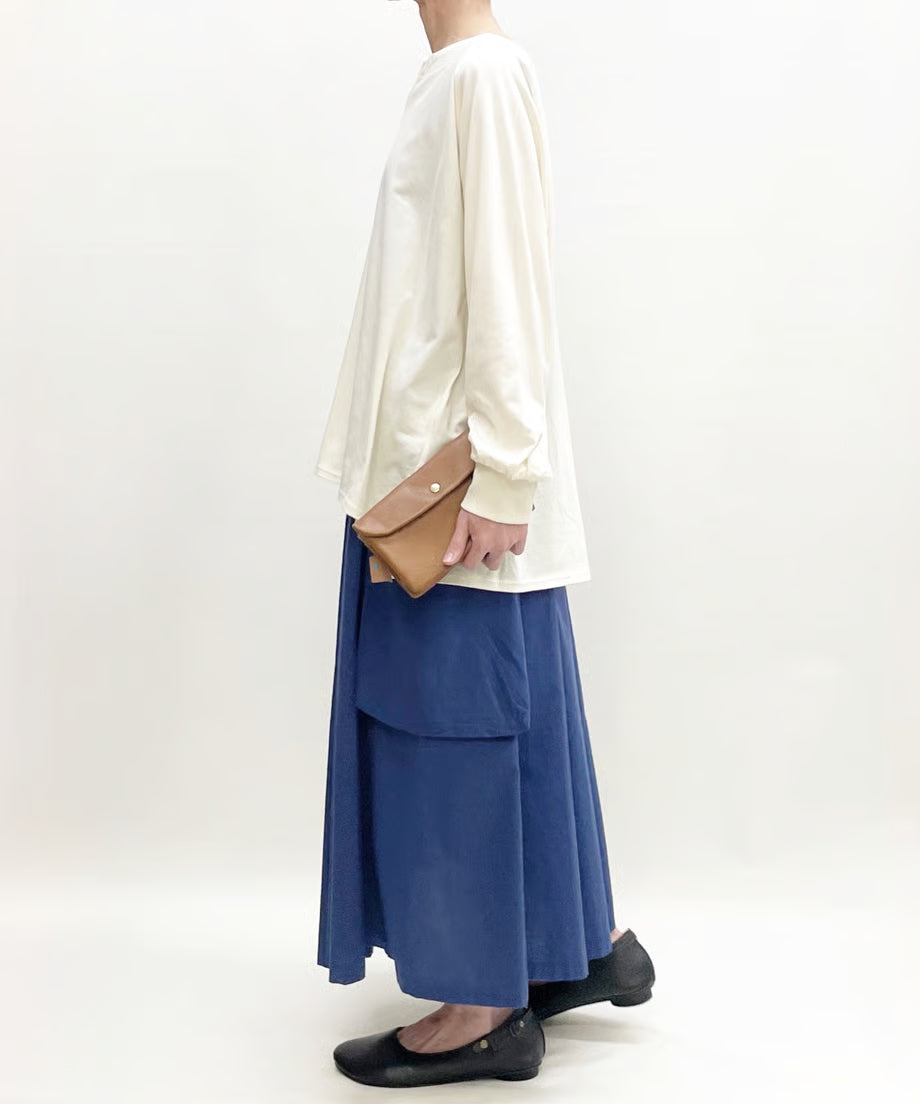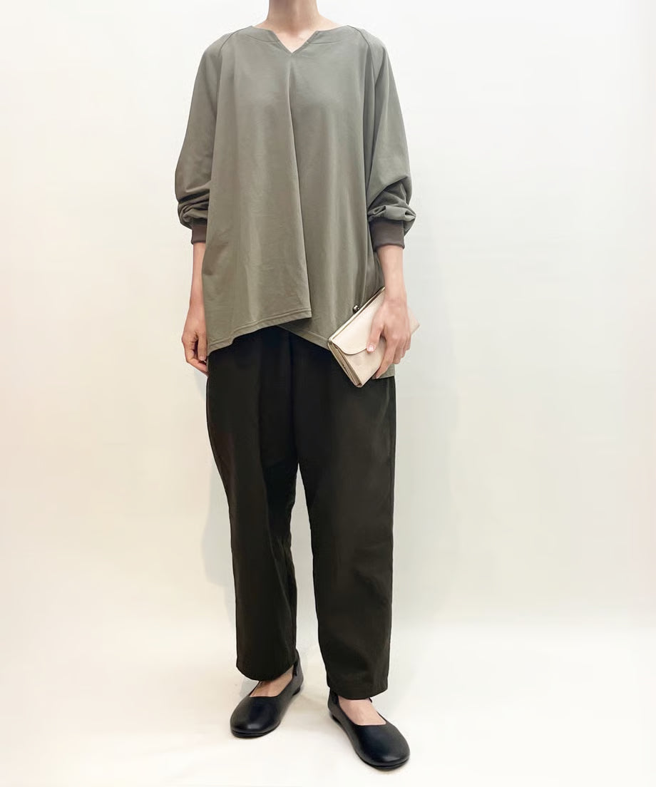 後ろ下がりのシルエットは、おしりが隠れるくらいの着丈で、スタイルよくリラックスして着ることができます。